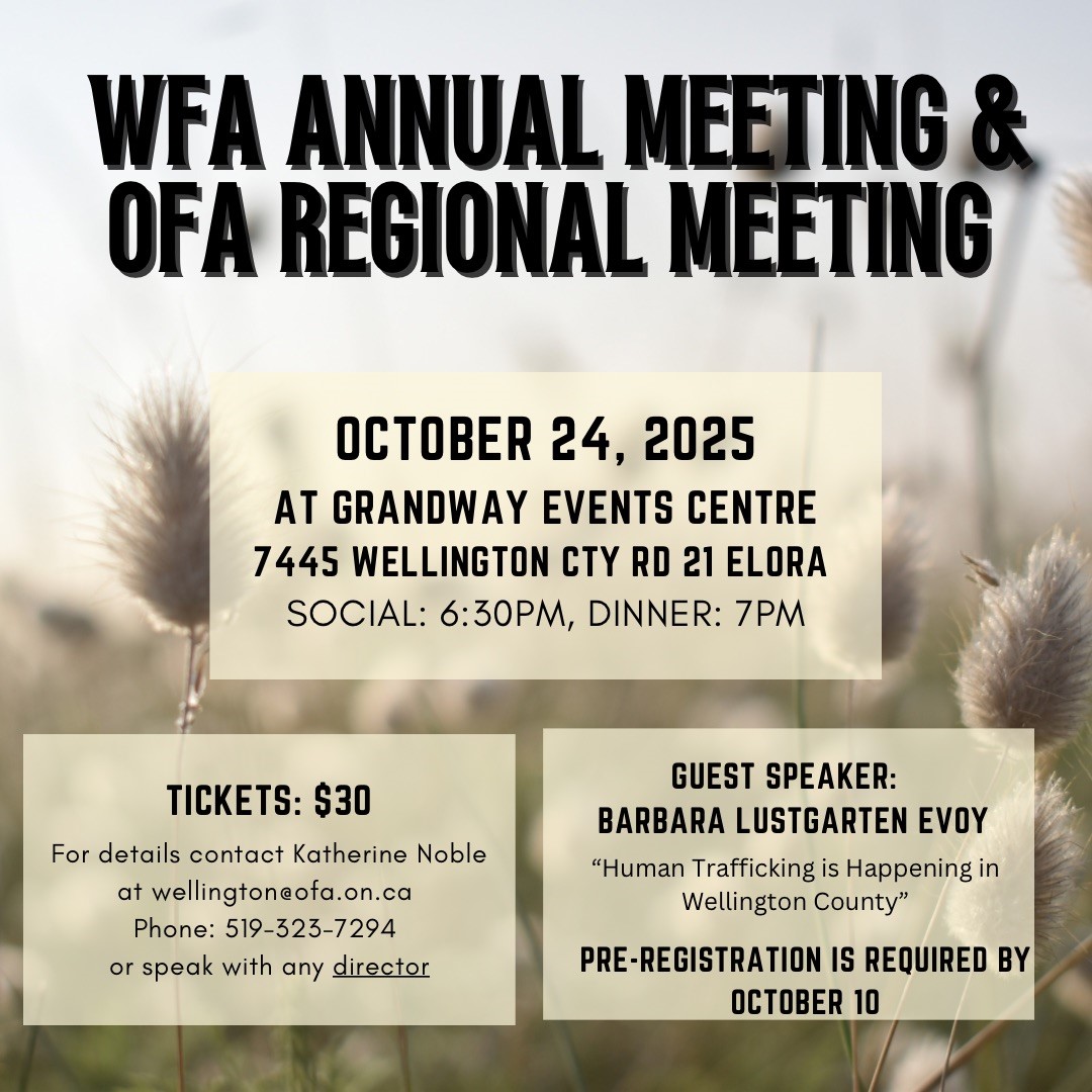 WFA AGM and OFA Regional Meeting is at The Grandway this year on Oct 28! Tickets are $20 each and feature a plated Pork Tenderloin dinner.